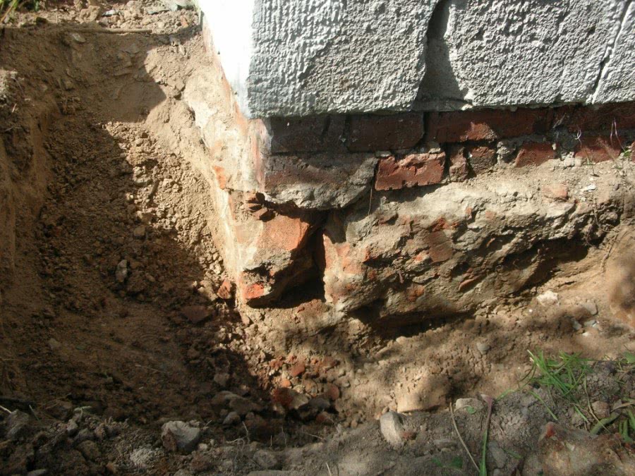 Первым делом нужно убрать штукатурку. И сразу будет как на ладони вся ситуация с фундаментом – насколько серьезны его повреждения. Если да, то придется дополнительно прорыть траншею и закрепить с помощью анкеров металлическую сетку. Далее выстраивается опалубка и заливается бетонным раствором. Как только затвердеет бетон – опалубка снимается, а саму траншею нужно засыпать и хорошо утрамбовать.
