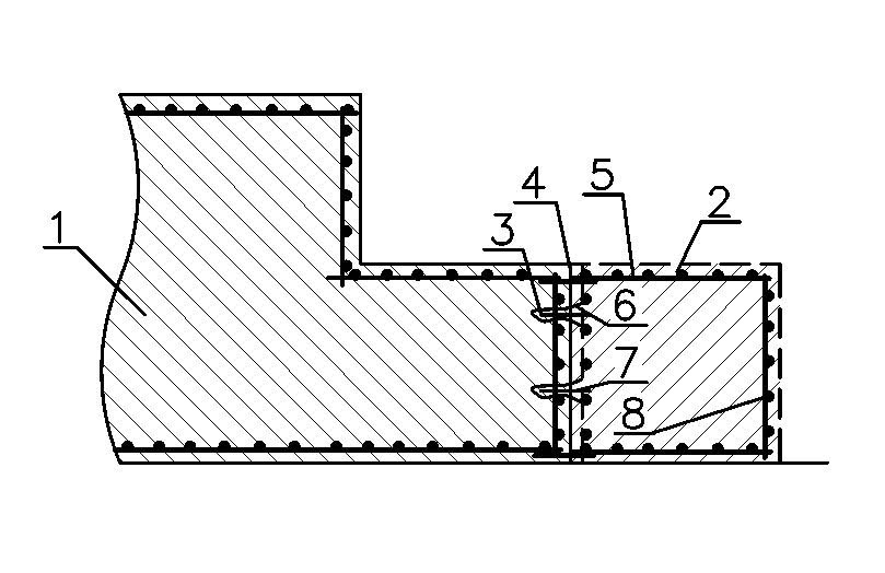 Усиление фундамента за счет монолитной обоймы: 1 – существующий фундамент; 2 – «наращиваемый» армокаркас фундамента; 3 – «коротыши» из арматурной стали для связи армокаркасов; 4 – электросварка рабочих стержней каркаса; 5 – монолитный бетон «рубашки»; 6 – «шпонка» для обнажения арматуры; 7 – «коротыши» и 3 стержня по 12-16 мм; 8 – армокаркас рубашки.