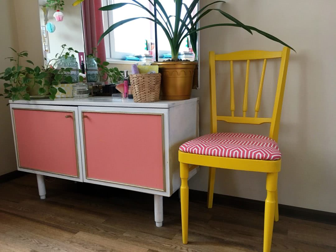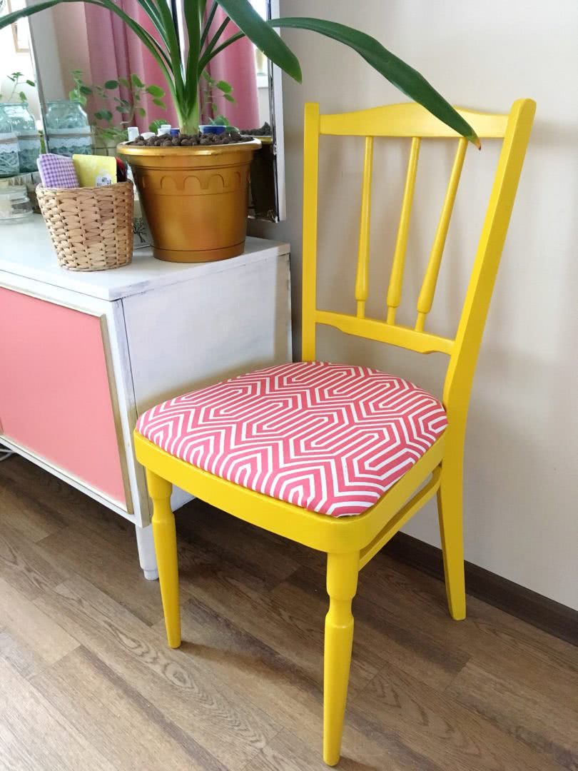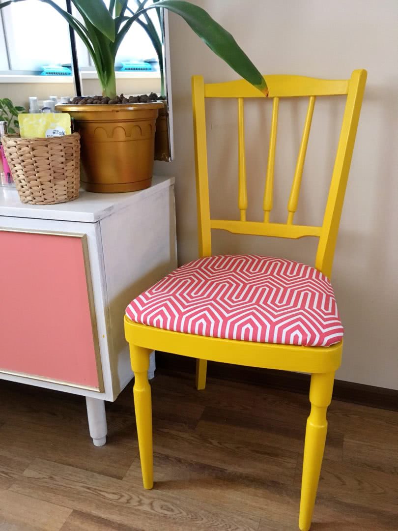 Был старый обшарпанный стул, который было жалко и хотелось отнести на помойку, а получился яркий и радостный жёлтый стул с современным принтом на ткани, отлично вписывающийся в интерьер. Краска и кисточка могут творить чудеса.