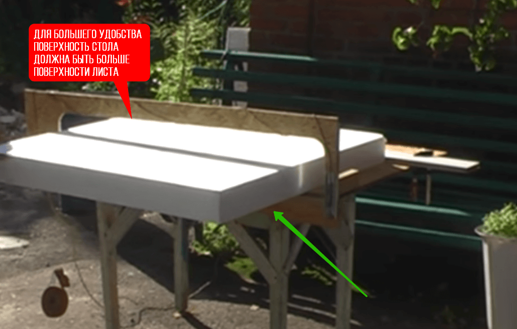 Изготавливать оборудование для резки пенопласта начните с разметки и обрезки рабочей поверхности. Её геометрические размеры определите в соответствии с размерами разрезаемых плит. Лучше, если поверхность стола будет больше площади листа.