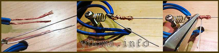 После снятия изоляции с концов проводов на длину около 20 мм, медные проводники навиваются на струну нихромовой проволочки в месте ее крепления к пружине. Затем, удерживая нихромовую проволочку за петлю плоскогубцами, сделанная обвивка медного провода овивается свободным концом нихромовой в противоположную сторону.