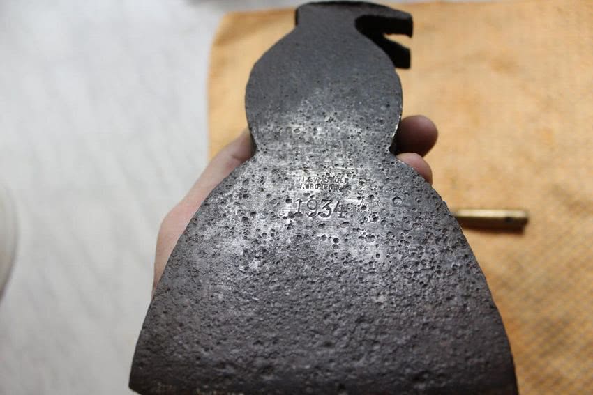 Топор требуется отмыть от соли под проточной водой и высушить, после чего удалить с него краску. Это можно сделать мелкой наждачной бумагой или ацетоном. Далее вся поверхность должна быть отполирована. Для этой цели прекрасно подойдёт войлочный круг, установленный на наждаке или дрели. Только после полировки можно полностью оценить, каков результат произведённой работы.