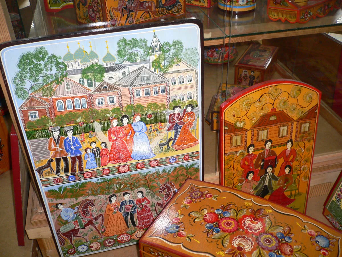Городецкая роспись – основные мотивы составляют рисунки, посвященные городским сценкам, былинам и цветочным композициям.