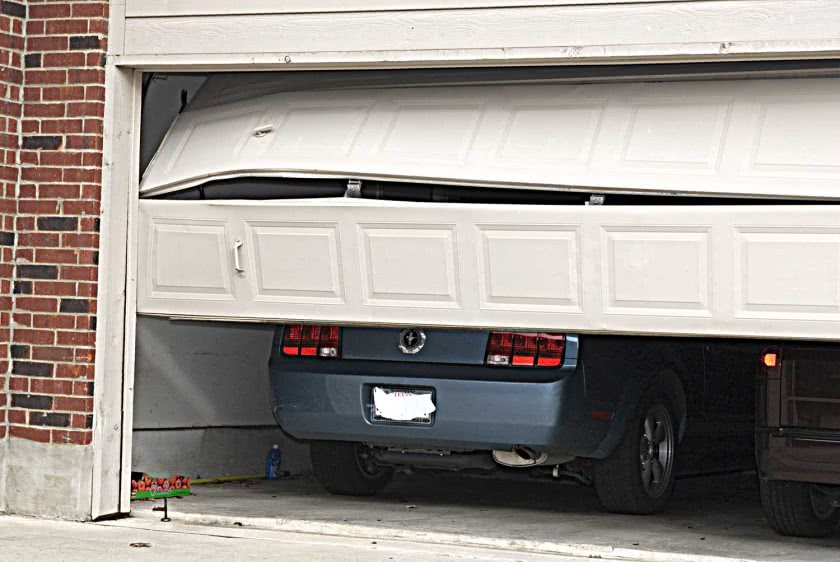 На гаражных воротах модно выполнять изображение техники или животных, которые вроде бы стоят в проеме двери, как показано на фото.