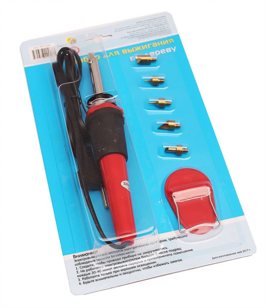 В комплекте присутствует: удобная подставка, которая отличается качеством, оборудование для выжигания, сменные насадки и прочие материалы, предназначенные для обеспечения максимального удобства. Устройство изготовлено в России, поэтому качество сборки выполнено по стандарту ГОСТ. Предназначено только для детей, потому что ручка отличается небольшими габаритами.