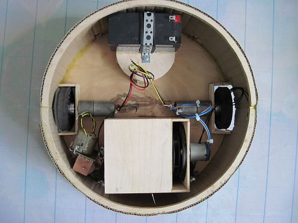 - Закрепить основные компоненты. Чтобы средства передвижения робота-пылесоса, кулер, микросхемы, аккумуляторы и вся прочая начинка устройства были надежно закреплены, вам потребуется фанерная основа. Она же по совместительству будет днищем вашего пылесоса. Туда же крепятся предварительно склеенные между собой при помощи суперклея турбина и емкость для сбора отходов. Также контейнер должен быть оборудован специальной трубкой, через которую будет выводиться выдуваемый воздух. Она должна быть защищена плотной тканью, которая послужит средством фильтрации. Кулер должен быть последовательно склеен со всеми сервоприводами, после чего посажен на все ту же фанерную площадку, на которой к тому времени уже должны быть монтированы микросхемы и аккумуляторы для подпитки устройства. Колеса для робота пылесоса могут быть куплены на рынке (однако вы можете предпринять попытку сделать их своими руками из консервной банки).