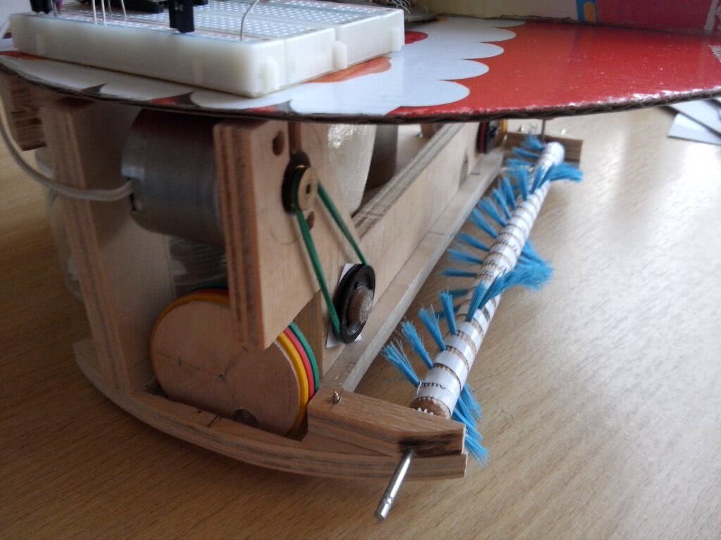 - мотор, отвечающий за движение передней щетки, подключается в Arduino через MOSFET. При этом в том случае, когда робот-пылесос находится в движении, щетка вращается достаточно медленно для того, чтобы пыль, грязь и мусор не разбрасывались по комнате, а, наоборот, собирались вместе и втягивались в жерло. А если робот находится возле стены или угла, щетка ускоряет темп своей работы, так как большинство пыли и грязи как раз и скапливается вдоль плинтусов;