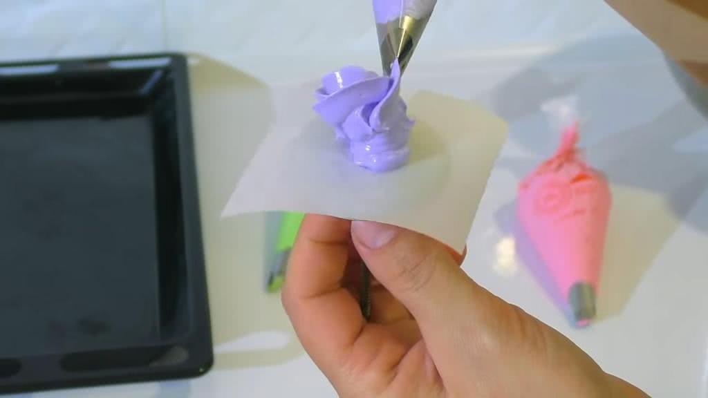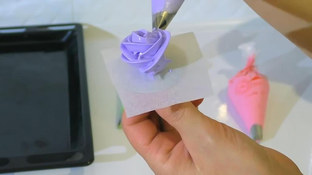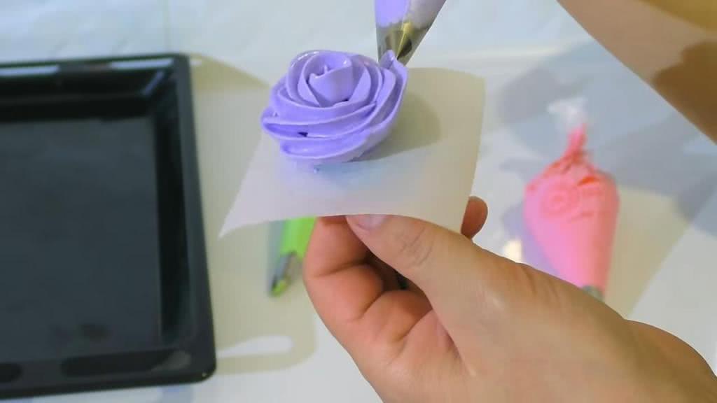 Обязательно используйте соответствующие кондитерские насадки. С ними вам будет намного проще делать цветок. Также я бы посоветовала, если вы делаете цветок из крема в первый раз и еще волнуетесь, то используйте вместо гвоздика бисквит, который вы поставите впоследствии на торт. Продумайте дизайн таким образом, чтобы это не казалось странным. Если у вас еще не было опыта и вы не умеете снимать хрупкий цветок с гвоздя, то есть шанс, что повредите его во время этого этапа.