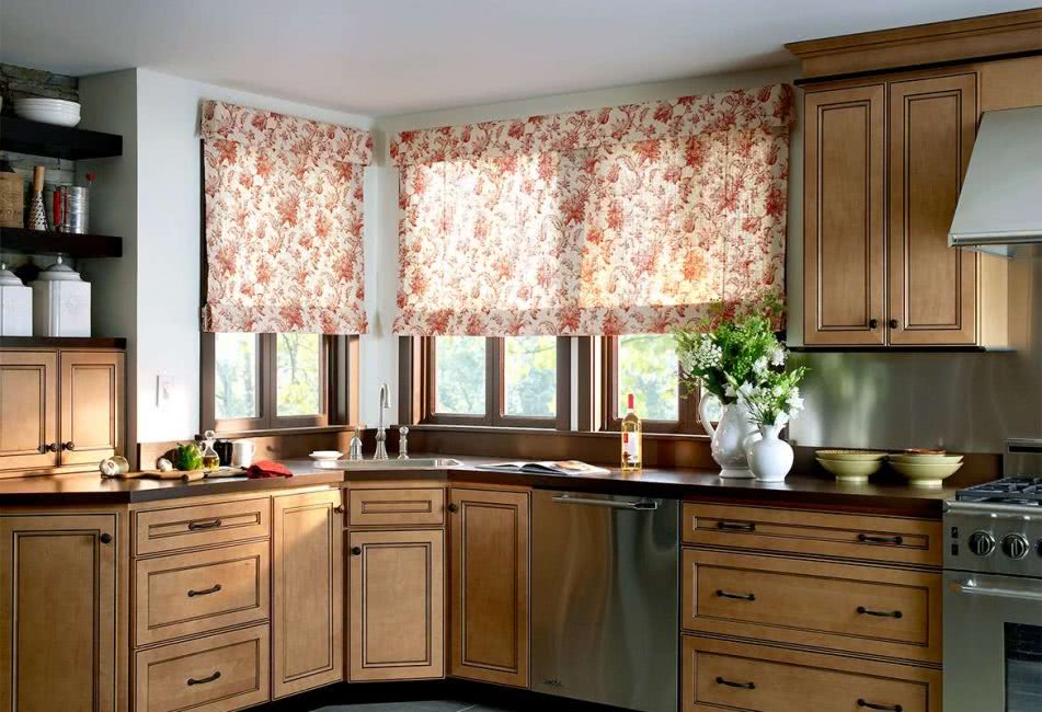 - Они не должны бояться повышенного уровня влажности, быстро пачкаться и мешать нормальному приготовлению пищи. Под все указанные критерии подходят рулонные шторы.