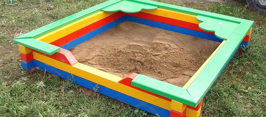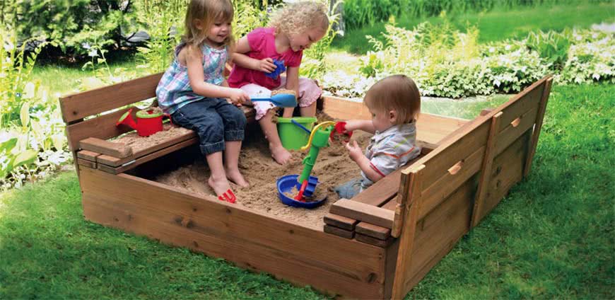 Для малышей обязательно понадобится песочница. Ее бордюры интересно будут смотреться из разноцветных бутылок или деревянных срубов. Оригинально будет смотреться песочница в виде корабля или машины. Над песком рекомендуется сделать тент для защиты от яркого солнца.
