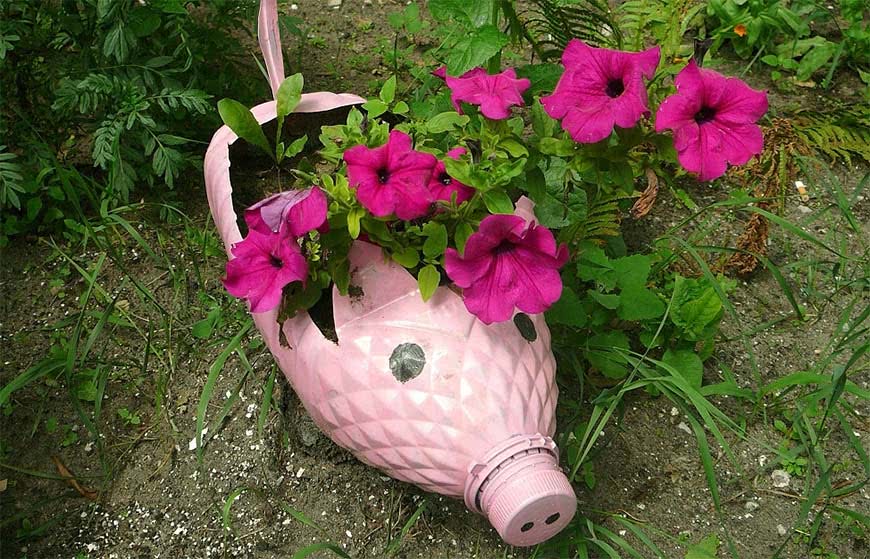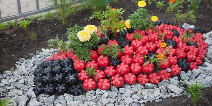 Особой популярностью у дачных дизайнеров пользуются бутылки, пластиковые баночки. Из них легко и просто соорудить множество интересных скульптур, украшений для цветников, бордюров. Здесь нет границ для фантазии.