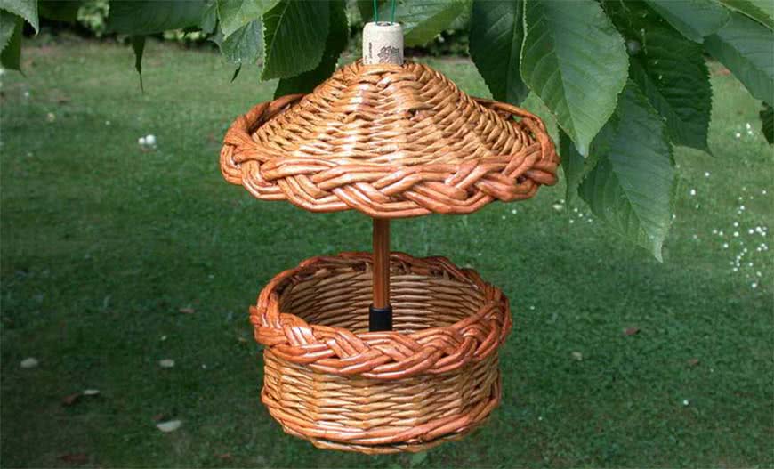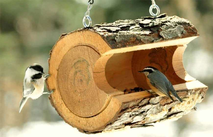 Обязательно нужно разместить на даче кормушку для птиц. Дети обычно любят наблюдать за пернатыми. А с кормушкой птички будут частым гостем на дачном участке. Ее можно сделать и из пластиковой бутылки, и из ненужного чурбака, и из прутьев.