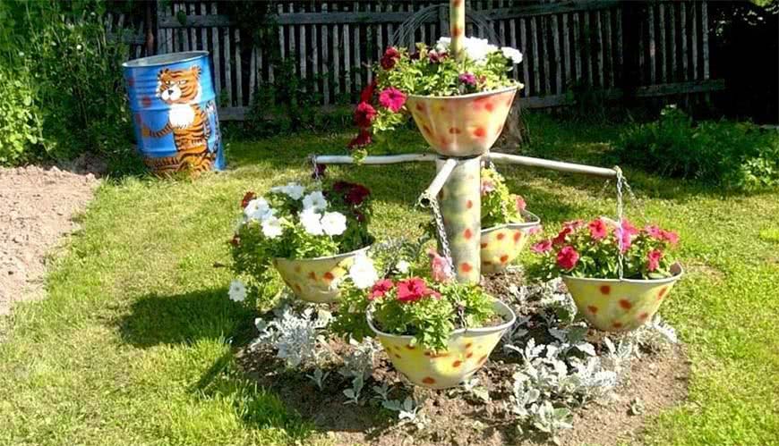 Ни на одной даче оформление не обходится без затейливых интересных клумб. Уникальности цветочным композициям можно добавить, высадив их в старые емкости. Это могут быть и бочки, и кастрюли, и даже тележки. Многие дачники сооружают различные штакетники для цветников.