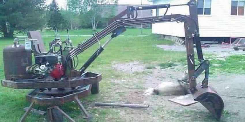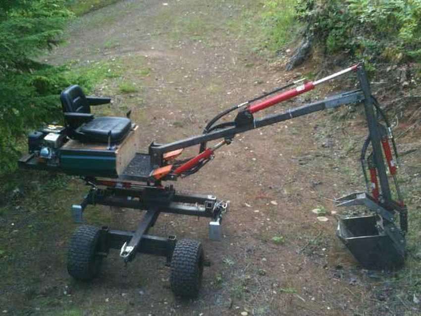 - Экскаватор из мотоблока, на базе имеющегося минитрактора или просто автомобиля. На нем используется навесное оборудование. Собирается автономная техника на гусеничном или автомобильном колесном ходу, способная перемещаться по участку самостоятельно. Другой вариант — машина, перемещаемая с использованием вспомогательных средств. Если понадобится, все навесное оборудование легко демонтируется, а использованная база снова используется по прямому назначению.