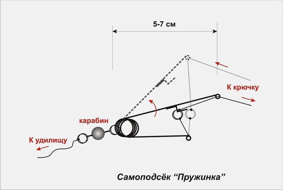 Когда рыба берет приманку и увлекает ее за собой, то пружина растягивается до определенного момента, что создает некоторое сопротивление движению рыбы. После этого, происходит резкая остановка, и крючок цепляется за ее губу. Это и есть, так называемая самоподсечка рыбы. После этого, можно приступать к вытаскиванию рыбы, хотя она уже никуда не денется с крючка. В зимний период подобное устройство полезно, как никогда.