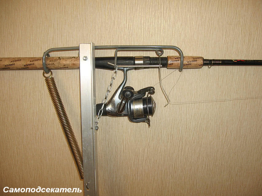 - На подставке удочки. Рукоять снасти располагается и закрепляется на специальном кронштейне, который с момент поклевки поднимает удилище вверх. Происходит это в момент натяжения лески, зацепленной за крючок подсекателя.