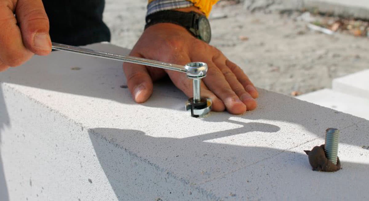 Крепление анкером в пеноблок используют при установке мауэрлата. В таких случаях возможен только один вариант фиксации — с помощью анкерных болтов с гайками. Принцип работы не отличается от такового при строительстве кирпичных зданий.