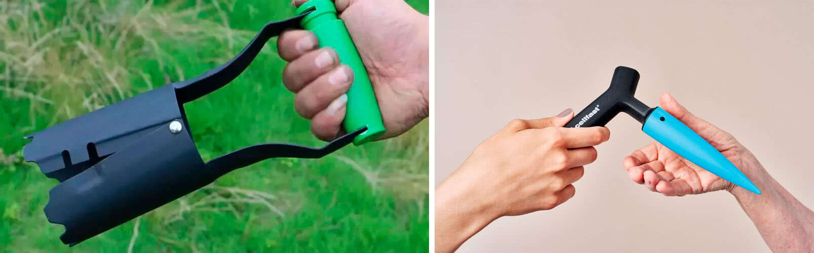 Этот инструмент, в народе именуемый – сажалка, является самым простым и состоит из рабочей части (конус) и ручки (держателя инструмента).Раздвижной механизм конуса обеспечивает удобство выемки грунта и засыпания лунки.