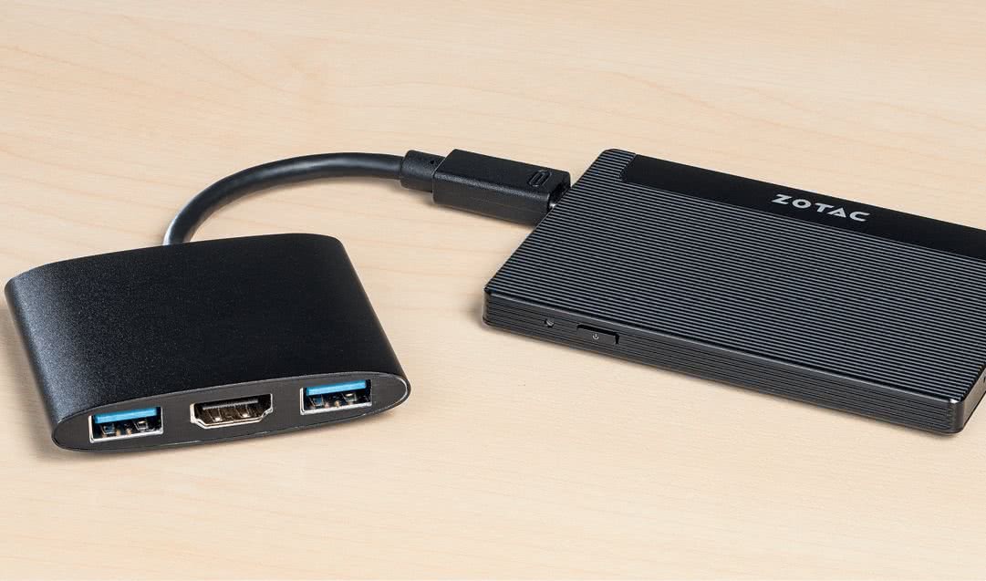 Zotac PI225: слишком мал для разъема HDMI. Мини-ПК размером с пластиковую карточку комплектуется адаптером для HDMI и USB Type-A, который можно подключить в один из двух разъемов USB Type-C