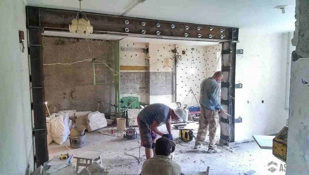 - Если при перепланировке требуется сделать новые двери или окна, то усиление ставят до того момента, как начинается разбор стены;