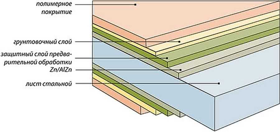 Металл покрывается несколькими оболочками с защитными свойствами. Обязательно идет оцинковка, а затем накладываются дополнительные слои — грунтовки и полимерные покрытия, которые защищают и придают более «цивильный» вид.