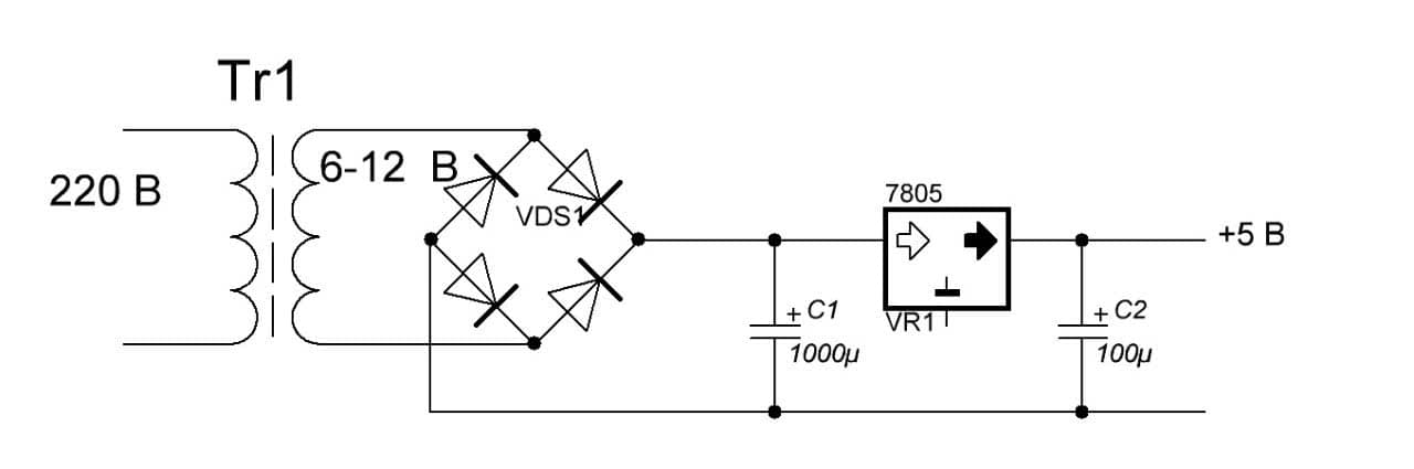 Как же сделать простой и высокостабильный источник питания на 5, на 9 или даже на 12 Вольт? Да очень просто. Для этого Вам нужно прочитать вот эту статейку и поставить на выход стабилизатор на радиаторе! И все! Схема будет приблизительно вот такая для блока питания 5 Вольт:
