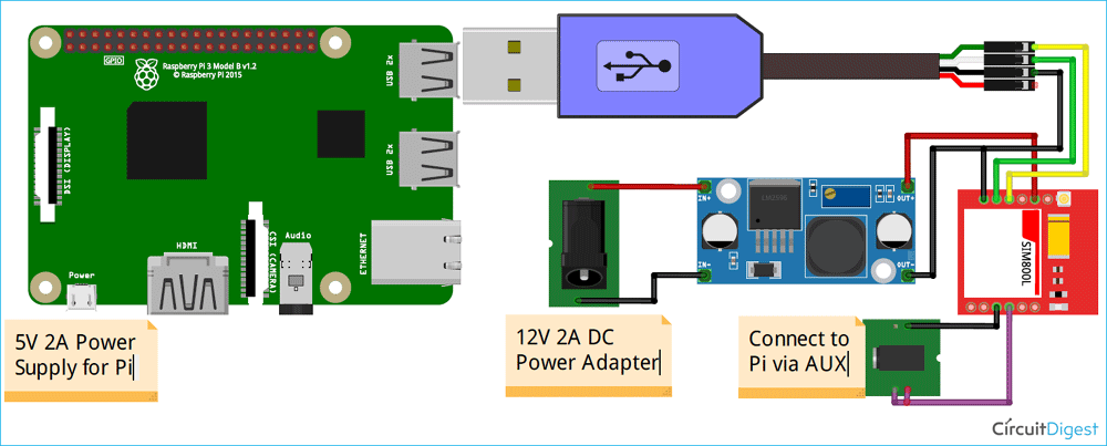Подача питания на модуль SIM800L: одна из главных составляющих успешной работы данного проекта – это обеспечение достаточного питания для модуля SIM800L. Напряжение питание для данного модуля может составлять от 3.7V до 4.2V – хорошо подходит для питания от литий-полимерных батарей (Li-po batteries). Оптимальное напряжение питания для модуля составляет примерно 4V. В схеме мы использовали понижающий конвертер (Buck converter) LM2596 для преобразования напряжения 12V 2A с выхода адаптера питания в напряжение питания 4V, которое требуется модулю SIM800L. Также убедитесь в том, что вы используете достаточно толстые и надежные провода для соединения понижающего конвертера и модуля SIM800L (чтобы по ним мог протекать достаточно большой ток).