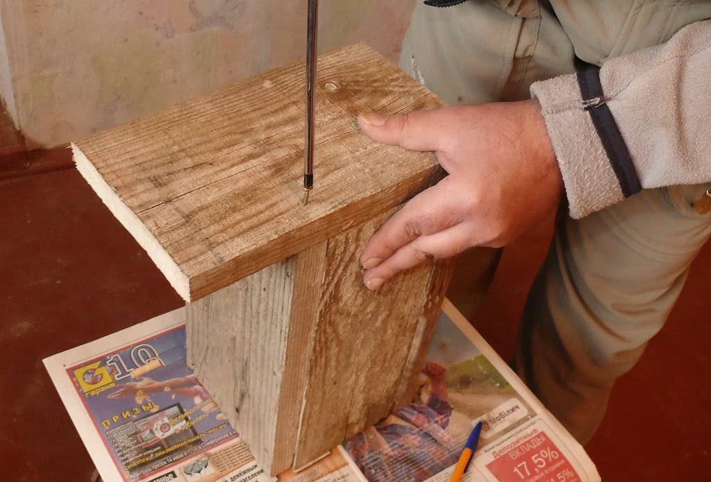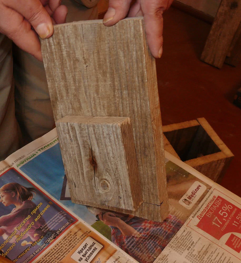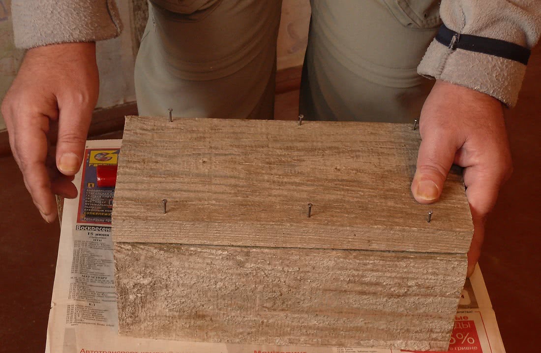 Для боковых стенок потребуются заготовки шириной 16 см и длиной 26 см, для дна — 12×12 см. Дно вставляют между боковыми стенками и прибивают гвоздями. При этом необходимо отступить от торцов на 2 см с каждой стороны в расчёте на фасад и заднюю стенку.