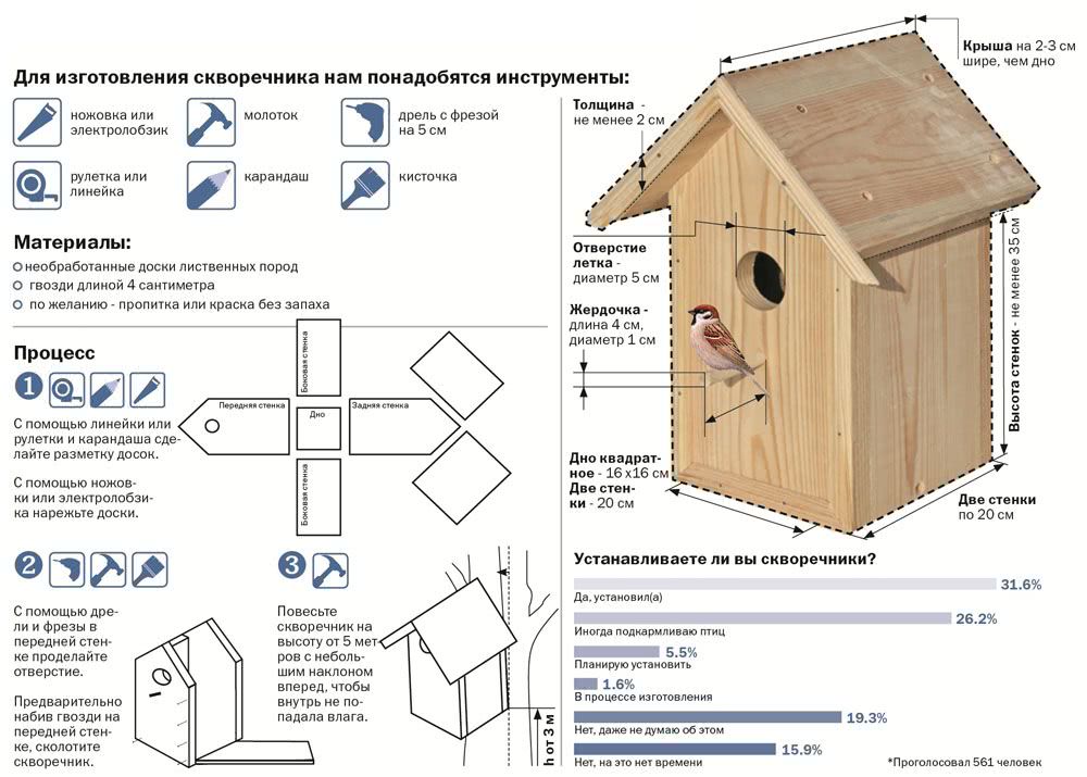 Решая, как построить изделие своими руками, выберите для начала простую конструкцию, имеющую стандартные размеры для скворечника.