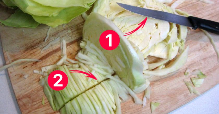 - Каждый раз после окончания нарезки капусты по плоскости нужно отрывать нож от поверхности кочана, заносить его снова и повторять движения вперед-назад, «сползая» вниз.