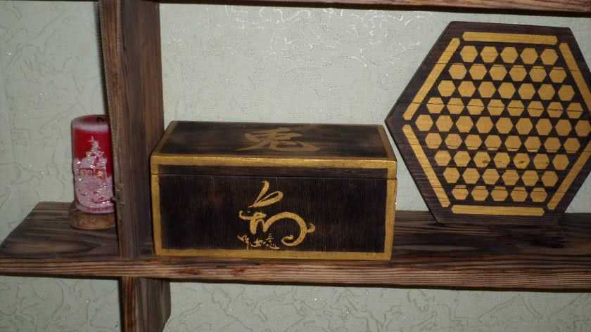 - Затем при помощи инструмента для выжигания дерева рисунок переносится на поверхность шкатулки.