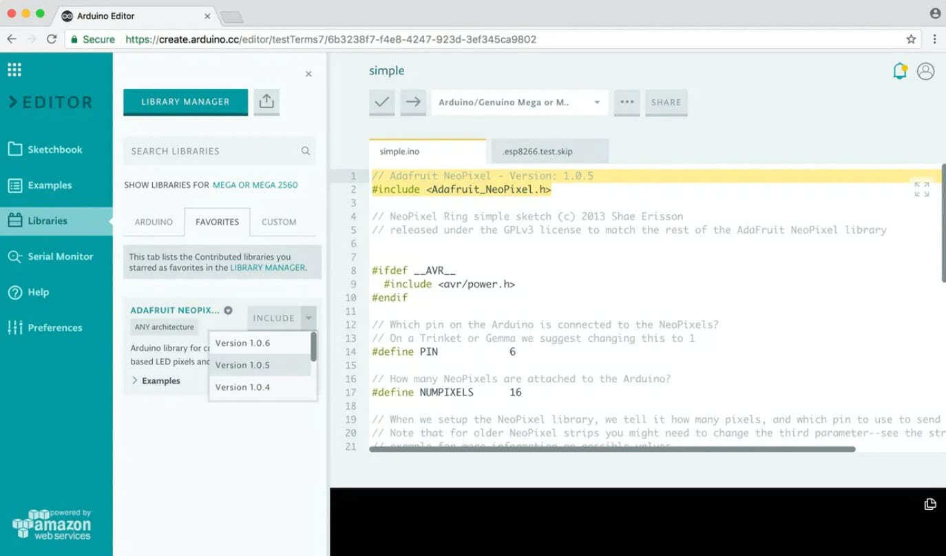 Но что делать если вы хотите использовать строго определенную версию библиотеки? Для этого найдите эту библиотеку в менеджере библиотек и отметьте ее звездочкой – то есть добавьте ее в избранные. После этого она появится во вкладке «избранное» (Favorite) на панели библиотек (Libraries panel). И здесь вы уже можете указать нужную версию данной библиотеки и включить ее в ваш скетч. Сервис Arduino Web Editor добавляет в скетч специальные метаданные с номером версии библиотеки, поэтому компилятор (Arduino Builder) подключит в ваш скетч именно ту версию библиотеки, которая вам нужна. Во время компиляции скетча в этом онлайн редакторе сначала учитываются кастомные (custom) библиотеки, затем те библиотеки, которые вы добавили к себе в избранное, и затем встроенные (built-in) библиотеки Arduino.