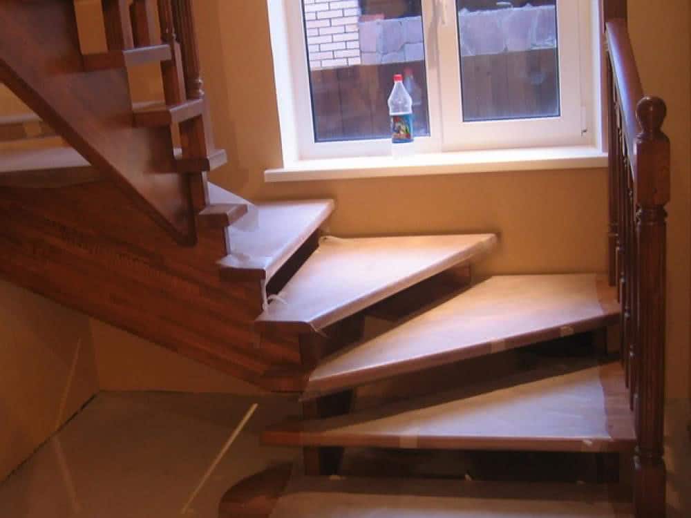 Модели с поворотами маршей устанавливают в углу или у стены. Площадки в них играют роль элемента, необходимого для разворота. Повороты выполняют на 90° или 180°. Двухмаршевые лестницы не занимают много места, но подниматься и спускаться по ним достаточно удобно. Забежные ступени в таких случаях просто незаменимы. Минимальное занимаемое место при 3-метровой высоте этажа – 160х180 см.