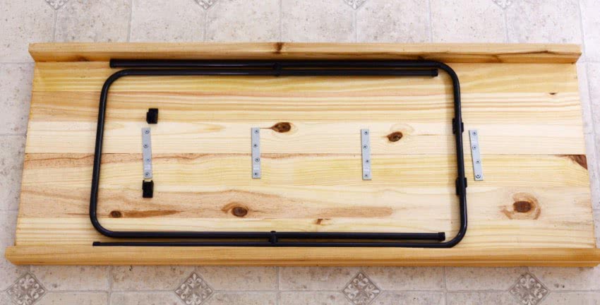 Чтобы итоговая конструкции удерживала форму и была прочной, по краям располагают пару съёмных брусьев, к которым крепятся ножки.