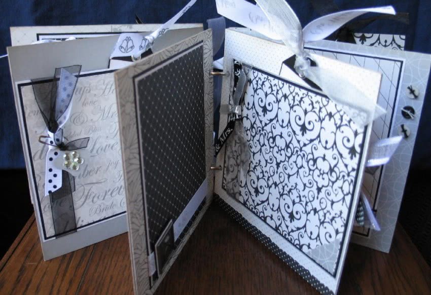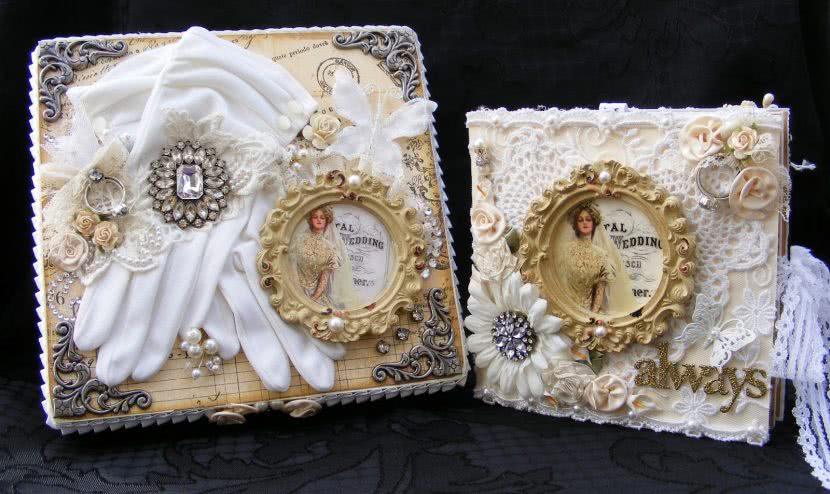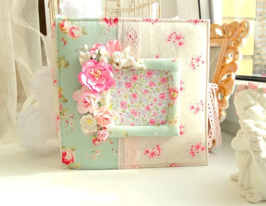 Однако эти альбомы смотрятся очень романтично, трогательно и душевно. Их особенно хочется украшать, добавив аппликации, ленточки, бусинки, кружева. К тому же такой вариант располагает к творческому процессу.