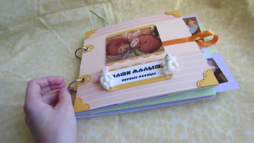 Новичкам стоит попробовать себя в оформлении своими руками альбома небольшого объёма – 15-20 страниц. Украсить семейный альбом внутри можно отсканированными документами, роддомовскими бирками новорожденных.