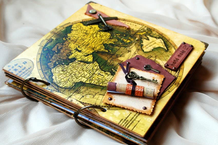 - брутальный, мужской альбом – это стимпанк, здесь необычные декоративные элементы – шестеренки, чертежи, миниатюрные механизмы, карты.
