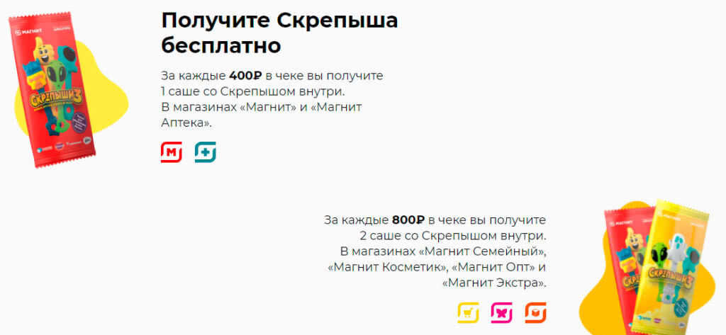 - В Магнитах форматов «У дома» или «Аптека» за каждые 400 рублей в чеке получайте одного Скрепыша совершенно бесплатно. То есть за чек суммой 799 руб. кассир выдаст вам только одного скрепыша, добавьте что-нибудь к вашей покупке, чтобы получить еще одного дополнительного.