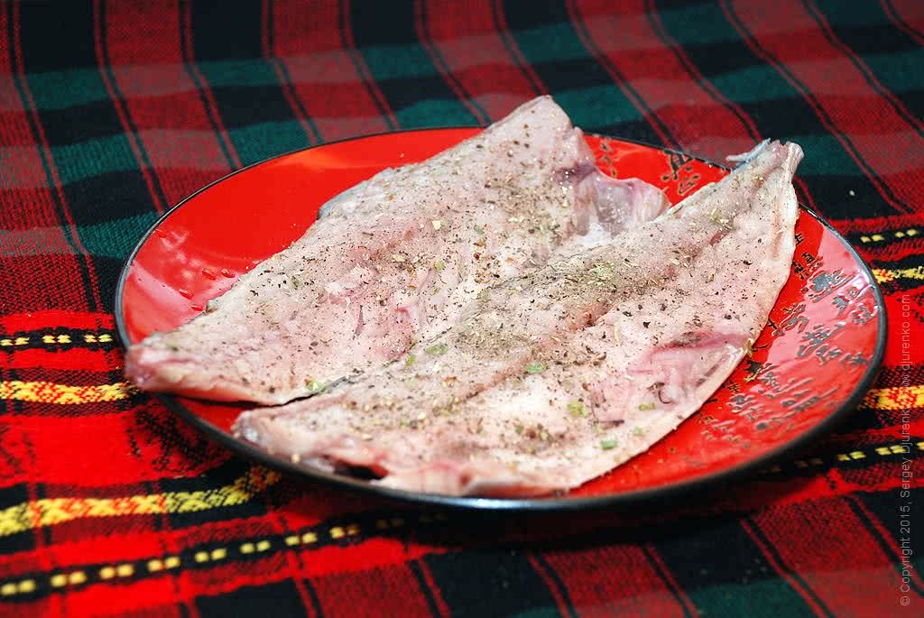 - Филе слегка перчим, или посыпаем смесью специй: перец, ароматные травы, кориандр. Можно не солить. И оставляем для сухой мариновки от 10 мин до 1 часа. В принципе можно добавить немного сухого или полусухого белого вина. Тогда рыба будет сочнее и лучше отобьется запах. Но это по желанию.