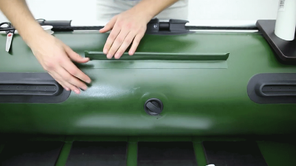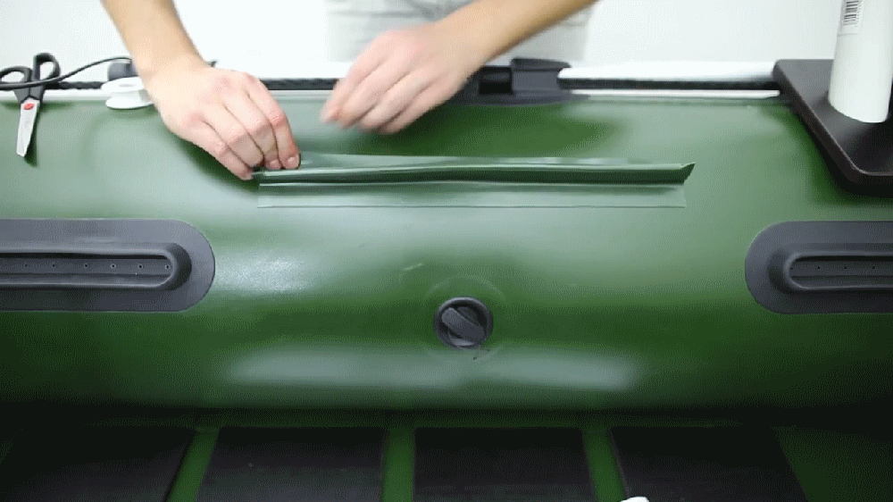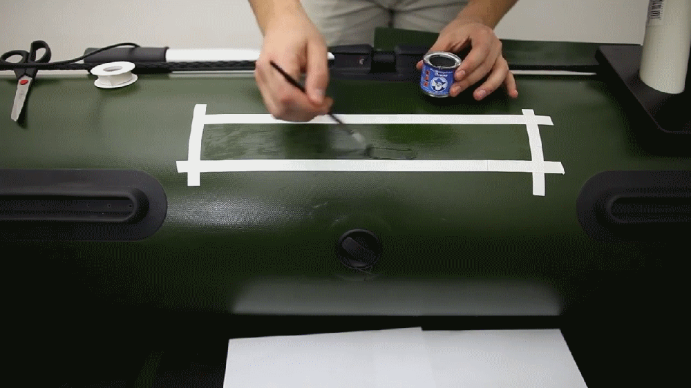 После необходимо ограничить место нанесения клея, малярным скотчем или изоляционной лентой. Эта процедура защитит не желательное попадание клея на чистые участки материала лодки. Это делать обязательно если Вы не хотите испортить свою лодку!
