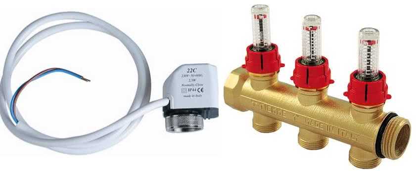 Такой вариант неплох, но регулировать расход, а значит, и температуру приходится вручную. Это далеко не всегда удобно. Для автоматизации регулировки на входах ставятся сервоприводы. Они работают в паре с комнатными термостатами. В зависимости от ситуации, на сервопривод подается команда закрыть или открыть поток. Таким способом поддержание заданной температуры автоматизируется.