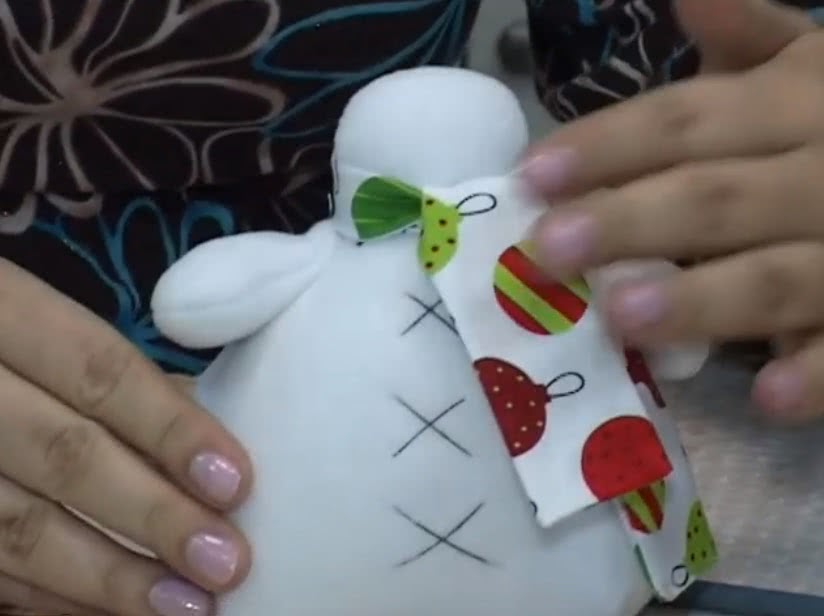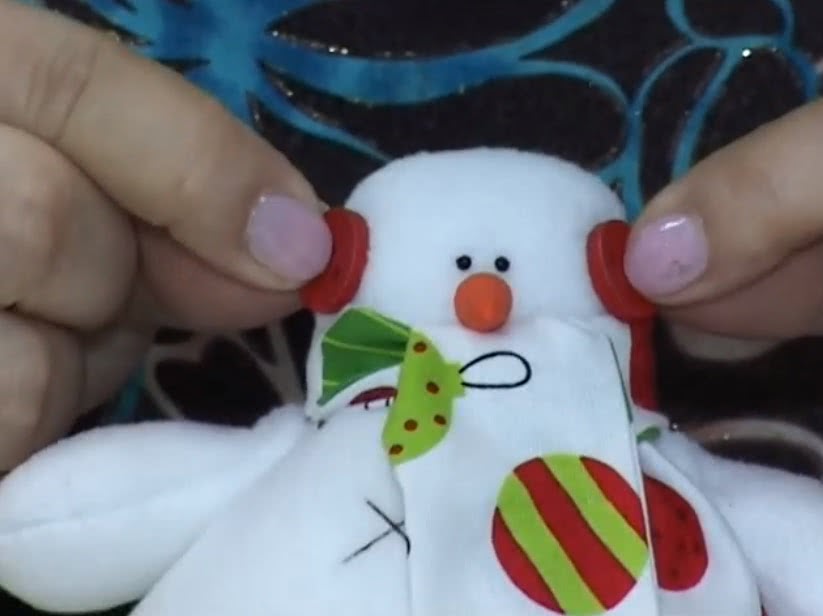 - Почти готовую елку помещаем в руках снеговика и пришиваем.