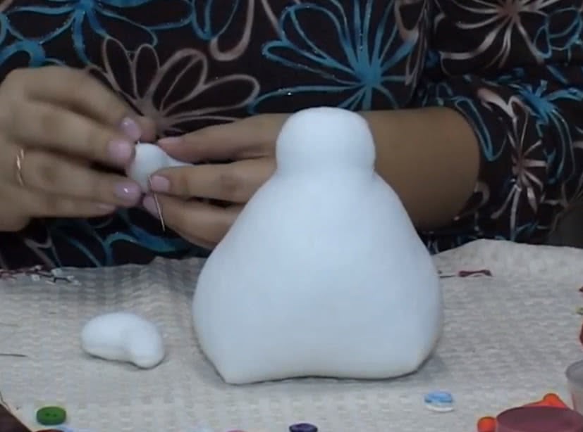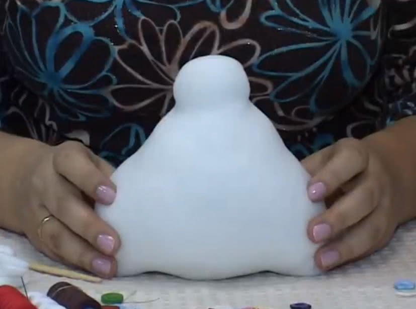 - Теперь нужно придать снеговику форму туловища, если наполнитель – крупа, то это будет сделать легко;