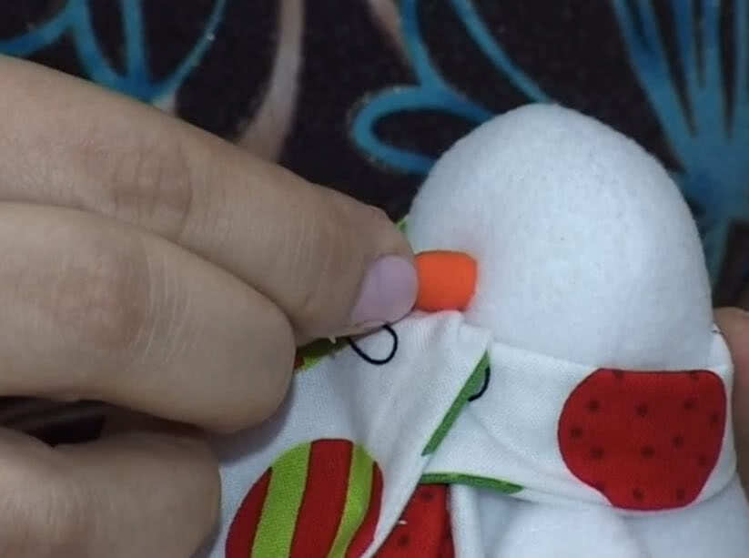 - Для того чтобы сделать игрушку нос, вырезаем из оранжевой ткани треугольник, сшиваем его, выворачивает и набиваем наполнителем. После этого пришиваем готовый нос потайным швом к голове игрушки.