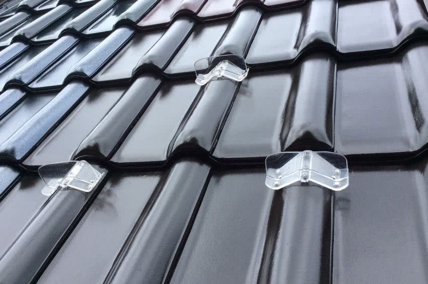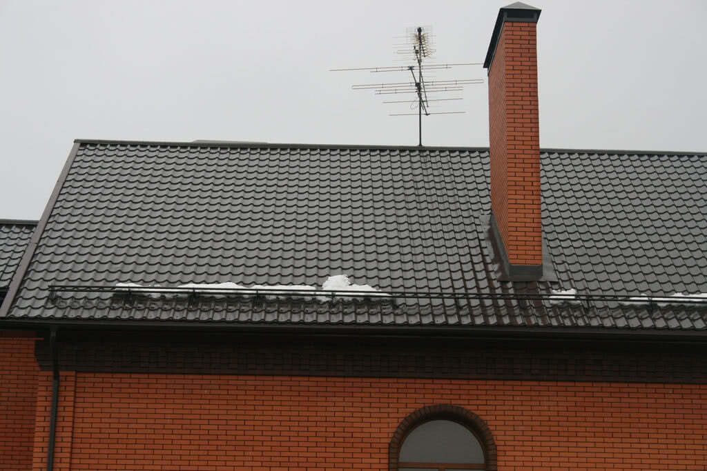Металлочерепица также является распространённым вариантом покрытия кровли. Установить снегоуловители на такую основу просто, а для работы подходят пластинчатые, трубчатые или решётчатые модели. Фиксация приспособлений проводится через кровельный материал. Если обрешётка слабая, то её нужно усилить путём разбора части кровли и установки дополнительных брусков по линии расположения снегозадержателей.