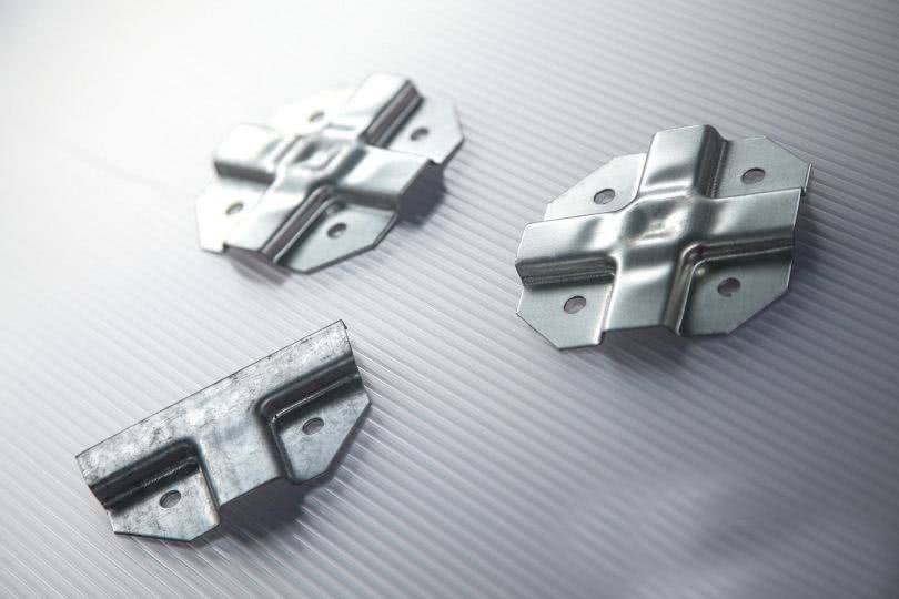Для изготовления хомутов и крепежных элементов для соединения профильных труб применяется покрытый защитным цинковым слоем или порошковой краской холоднокатаный лист толщиной 1,5 мм. Хомуты состоят из двух половинок, плотно охватывающих вставляемые в них профильные трубы. Между собой эти половинки стягиваются болтами и гайками. Популярные размеры систем: 95х65 и 95х95 мм.