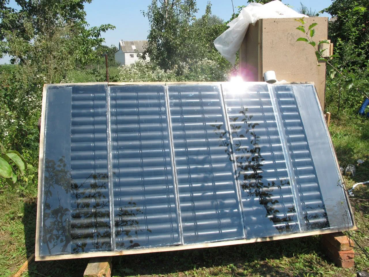 Солнечные водогрейные панели своими руками можно соорудить из непригодного холодильника или радиатора старого авто. Конденсатор, извлеченный из холодильника, надо хорошо промыть. Горячую воду, полученную таким способом, лучше использовать только для технических целей.