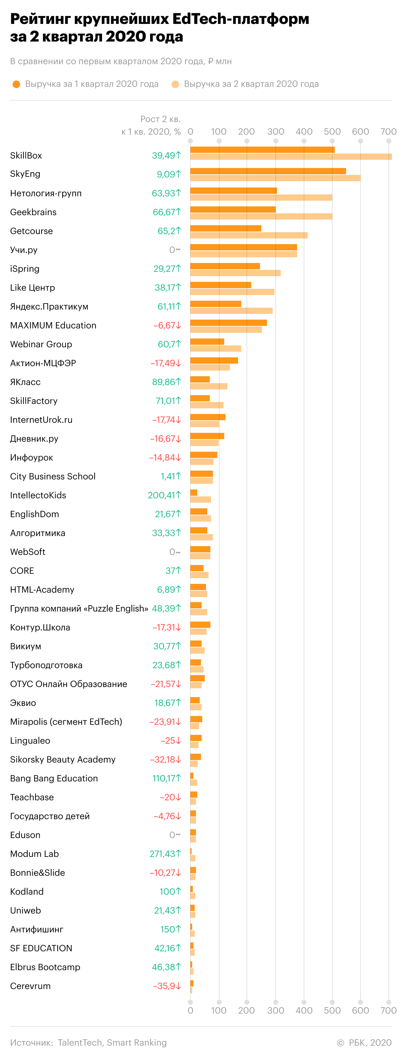 По итогам второго квартала 2020 года на рынке онлайн-образования произошла смена лидера. Исходя из оценки, впервые по объему выручки им стал онлайн-университет современных профессий Skillbox, обойдя лидера рейтингов 2018-2019 годов, школу иностранных языков Skyeng.