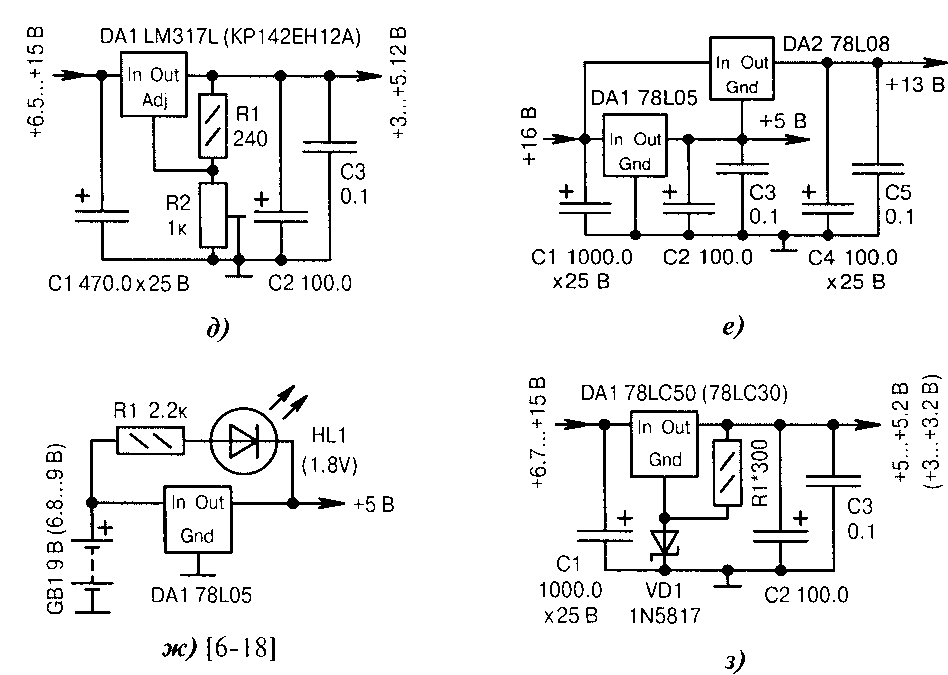 В схемах а) и б) ток стабилизации определяется номиналом резистора R. Применяя вместо постоянного резистора подстрочный можно регулировать выходной ток стабилизаторов.