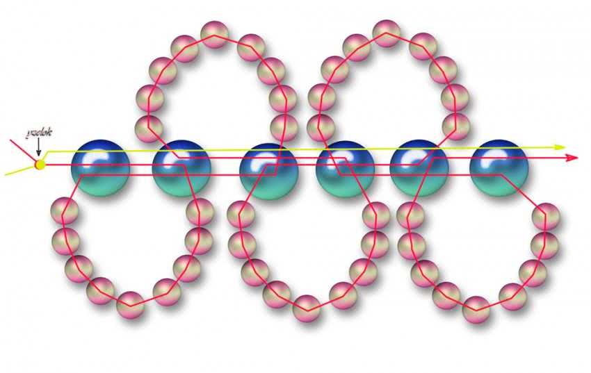 Следующее колечко формируется по такому же алгоритму: на нить набирается 12 стекляшек, оборачивается вокруг веревки и в натянутом состоянии фиксируется.